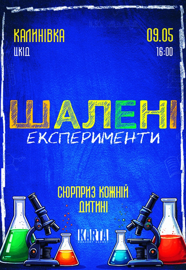 Интерактивное детское шоу "Сумасшедшие эксперименты" состоится 9 мая 2026, 16:00, суббота в Центр культуры и досуга. С помощью сервиса internet-bilet.ua, Вы сможете с легкостью забронировать, заказать и купить билеты на интересующий Вас концерт, спектакль, оперу, балет, мастер-классы, спортивные и детские мероприятия, оплатив их самым удобным для Вас способом: через интернет банковской картой VISA/MasterCard, наличными или курьером, если сделаете заказ билета c доставкой.